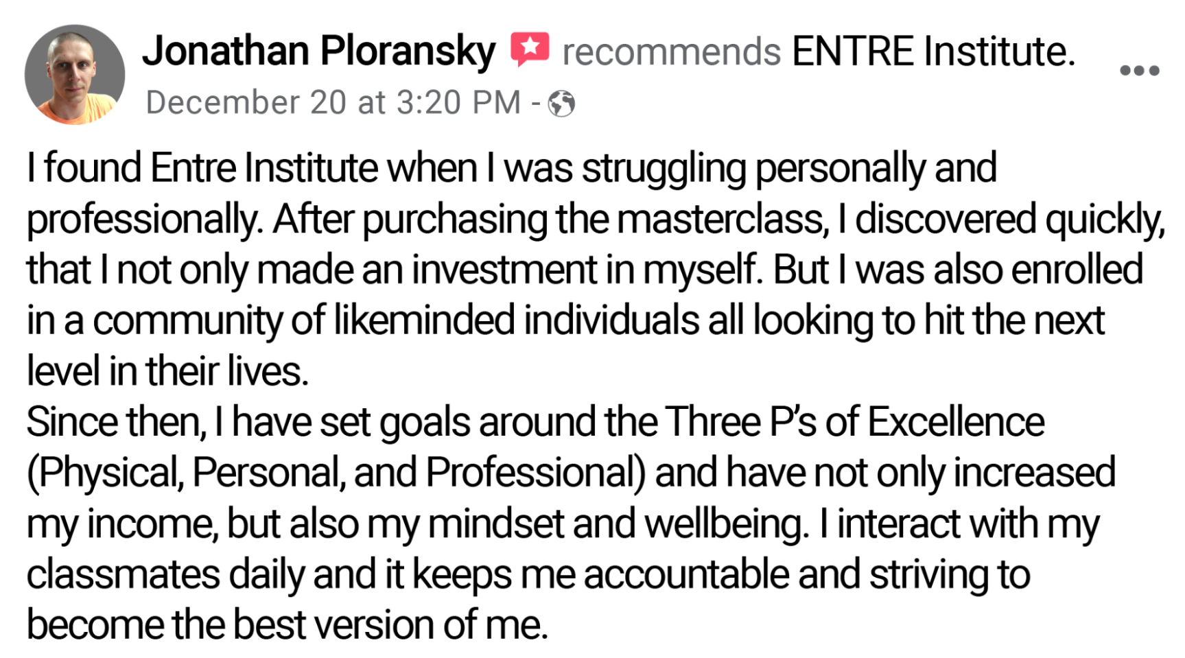 • The ENTRE Way Doctrine: This cheat sheet will help install the Entre “3P Matrix” into your life during the first few days of the program